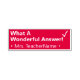 Den inspirerande utformningen av gummi frimärke visar det berömmande budskapet "Vilket underbart svar!" och en anpassningsbar lärare namn. Den innehåller också en dekorativ bock. Det skulle kunna användas av en lärare, lärare, instruktör eller lärare när de markerar uppdrag för att visa att student har gjort bra ifrån sig.