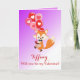 Ett vackert Alla hjärtans-dags-kort, framsidan visar en räv med en svart fluga och en röd-vit mössa. Han håller ballonger som är rosa och röda med rosa och vita hjärtan inuti. Under finns en plats för att personliggöra kortet med ett namn. Under namnet står "Vill du vara min Alla hjärtans-dag?" Beställ ditt redan idag!
