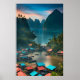 Ett traditionellt indonesiskt fiskesamhälle ligger vid vatten, omgivet av lush grönt backe och sten vid solnedgången