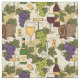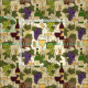 Fantastisk vintage, tryckväv med mönster av druvklasar, vindruvor, löv, vin flaskor, glas och fat