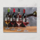 En hand kors röd vin i ett glas, med vin flaskor i bakgrunden.