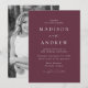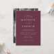 Minimalistisk, modern bröllopsinbjudan med information om bröllop i vit skrift med calligraphy-skript accents med vin lila bakgrund eller färg efter eget val. Baksidan av trendigets bröllopsinbjudan visningar ditt förlovning-foto för lodrät. Designad att samordna med vår moderna elegance bröllop-samling.