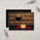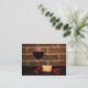 Det här artistkortet har en enkel bild av ett glas vin, en ostplatta och tre röda blommor mot en rustik röd tegelvägg.