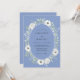 Mjuka vinblå nyanser bildar bakgrunden för en ömtålig krans av vita blommor och subtil grönska. Denna design frammanar en mild, romantisk atmosfär, perfekt för ett vår- eller sommarfirande. Den luftiga känslan och botaniska elementen skapar en förtrollande visuell upplevelse.