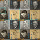 Vincent Van Gogh tyg, nyinspelning för fyra berömd självporträttteckningar i varm monokrom palett och snyggtstilsortstext med berömda målningar "för Starry natt" och "solros" i färger för blåttgultbakgrund