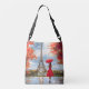 En graciös kvinna med ett rött paraplydroppar mot Eiffel Torn under en mjuk höstbryggning. Romantisk parisisk charm i rött och guld.