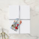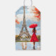 En graciös kvinna med ett rött paraplydroppar mot Eiffel Torn under en mjuk höstbryggning. Romantisk parisisk charm i rött och guld.