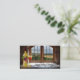Konstnärligt visitkort för ett vinföretag eller vingård med en målning av en vinflaska med glas på en retro fönsterbakgrund med landskapsvy.