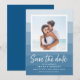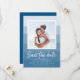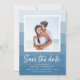 Brett och vackert spara datumdesignen med ditt favoritfoto i förlovning som är inramat i vitt mot en blå vattenfärgsbakgrund i rand. Anpassa med namn, bröllop-datum, plats och bröllop webbplats eller inbjudningsinformation. Med en chic och ett summariskt foto sparas datumkortet för strandbröllop, sommar-bröllop eller destinationsbröllop.