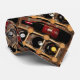 Denna färgrika tie presenterar ett upprepande abstrakt mönster av en upprätt röd och svart flaska av burgundy vin bredvid tre mer flaskor i en brunt, ett guld och en gul trävinkugge. En lantlig orange tegelstenväggbakgrund avslutar sammansättningen.