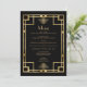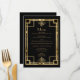 This elegant vintage-inspired wedding menu features gold-colored text on a black background, framed by a rectangular geometric vintage art deco border in faux gold foil. The back of the menu is solid black.