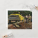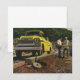 Vintage illustration affärsindustridesign med en arkitekt och en allmän entreprenör som står bredvid en gul arbets pickup. De blå kragade männen granskar några ritningar på en byggarbetsplats innan inspektören kommer för att godkänna projektet.