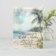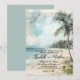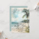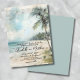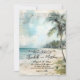 Distressed Rustic Vintage Tropisk Bröllopsinbjudan. Sätt tonen för din strandfirande med en vacker akvarelldesign med en dämpad kustpalett av tealblå, tan och grön. Bakgrunden visar en charmig distressed strandscen med mjuka havsvågor, mjuka sandstränder prickade med sjögräs och ett vintagepalmer elegant placerat till höger. Ett strandhus sitter i det avlägsna hörnet av scenen och tillför subtil charm utan att ta huvudrollen. Fantomskrivning och distressed pappersstrukturer förstärker designen med en vintage resestämpel vibe, perfekt för ett tropiskt eller kustinspirerat bröllop.
