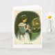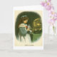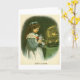 En vintage med titeln "Kittie's Lesson" med en liten flicka som håller kattungen upp till matsalen i hopp om att hon kan lära kattungen att inte skada fåglarna. Kortet är tomt för ditt handskrivna meddelande.
