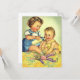 Vintage illustrerar barn och spädbarn med en tjej, storasyster, som matar sin söta leende baby bror flaska i mjölk. En mjukisdjur på kanin i Påsk ligger nära syskon.