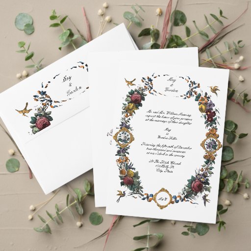 Very colorful and ornate antique Baroque Rococo cartouche wedding menus featuring floral garlands. You can easily edit the text and change the background color in this design template.