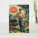 En levande vintage illustration som visar en glad man i en skjorta med gult och fedora och som står stolt bredvid ett grill lastat med sizzrande korvar och revben. I den idylliska bakgården ingår lush grey, en krukplanta, och en picnic bord med flaskor av kryddor och drycker, vilket framkallar charmen från klassiska arrangemang på 1950- eller 1960-talet utomhus. Det ljusa och inbjudande BBQ-tecknet ökar den nostalgiska känslan av denna återreklam.