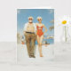 A striking vintage-style illustration of an unlikely pair enjoying a sunny seaside setting. An older man in casual attire stands beside a glamorous young woman in a vibrant red swimsuit. The coastal backdrop, palm trees, and bright sky create a relaxed holiday mood, while the contrast between the figures adds humor, charm, and storytelling appeal.