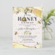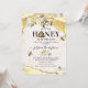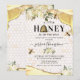Bjudningar till bihushållets babyfest med gula och gyllene glitteragat kristallkanter, en bikupans bakgrund, honungsdroppar, vita akvarellblommor, bin och en elegant firande mall som är lätt att anpassa.
