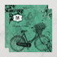 Vår Vintage Teal Bicycle bröllopsinbjudningar, OSA kort, keepsakes, porto, tackkort, lakan och andra bröllop, möhippa och pars duschartiklar är unika och vackra med en vintage cykel med en basket blommor och en muterad tealbakgrund med fåglar och svarta snurrar. Dessa är enkla att anpassa med all din bröllop, möhippa, pars dusch, tackkort eller OSA information!
