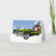 Fantastisk tecknad illustration av Jultomten som transporterar gåvor i grönt vintage Cadillac! Underbart kort för pappa eller fläkt i bilar.