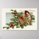 Två vackra rödbruna och bruna fåglar är sitta bredvid varandra på ett gren av holly och bär som är lätt täckta i snö. Hälsning: A God jul. Bild från ett Vintage-vykort.