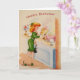 En bild av födelsedagskort för vintage med ett litet kvinnofönster framför ett bageributiksfönster med dekorerade födelsedagskalvar. Hon verkar ha kört på en rosa lagrar tårta. Kortets framsida säger "Grattis på födelsedagen" och meddelandet i kortet är: "Ta kakan!"