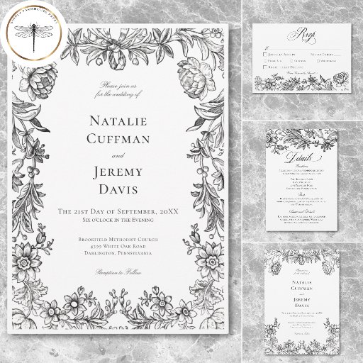Ge din speciella dag elegans med den här vintagens bröllopsinbjudan till blommigten, med en svart och vit tapestry-stil-illustration av blommor och löv som ger en skarp vit . Det invecklade botaniska gräns lägger till en klassisk, arvisk känsla, perfekt för traditionell bröllop, trädgård eller vintage. Skapat av Farmhouse Press. Om du vill ha anpassningsbar delarare eller om du vill begära en produkt som inte finns i vår butik kan du skicka e-post till simplyfarmhousepress@gmail.com.
