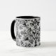 Ett mugg med ett blommönster av fuktig elegant av daisy och löv av vintage med scrollsar i svart på en grungande bakgrund av grått.