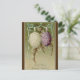 Detta vykort har en vintage som illustrerar två äggformade blomsterkluster som hänger från ett virvelturcityband. Tillsammans med de lilaska blommarna är fitta i grenar och ett budskap i Påsk nedan.