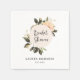 Dessa vackra bröllopsdusch servetter har en krans av eleganta persikofärgade vintage pionblommor, med mycket lövverk, gröna blad och grenar på en enkel vit bakgrund.