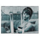3D digital återgivning av en vacker ung vintage sitta i en bil mot bakgrund av en sommarstad, blåfärgning
