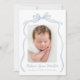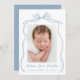 Firar din lilla ankomst med vår elegant Vintage Blue Bow-födelsemeddelande. Visa din nyfödds foto med en charmerande blå båge, med din baby namn i ett vackert handskrivet dammigt blått skript. Under kan du lägga till födelsedetaljer som vikt, längd och datum. Baksidan ger utrymme för ett foto från extra och ett personlig till nära och kära. Det här anpassadet är perfektens sätt att meddela din nyaste familjemedlem med stil och skam!