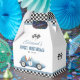These fun birthday party favor boxes feature a vintage blue race car and chequered flags. Personalized with your birthday party details and thank yo message on the reverse. Designed by Thisisnotme©