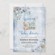 Inbjudan till vintage med en illustration av en baby-vagn och en baby-björn. I hörnen finns en bukett av blåa blommor