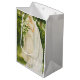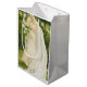 This image portrays an elegant bride standing gracefully in a lush, sunlit garden. She wears an ivory wedding gown adorned with delicate lace, subtle beading, and a softly gathered waist accentuated by a jeweled brooch. A long, translucent veil cascades behind her, catching the light and adding a sense of movement and ethereal beauty. The bride gazes gently downward at a cascading bouquet of white lilies and greenery, her expression calm and contemplative. Surrounded by dense foliage and tall trees rendered in soft, painterly tones, the scene evokes a romantic, timeless atmosphere inspired by classical illustration and Art Nouveau aesthetics.