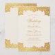 Denna eleganta bröllopsinbjudan med vintagekaraktär, rekommenderas för en svart klänning-fest, har vintage eleganta barocka guldförgyllningar på övre och nedre kanterna och en elfenbensvit (nästan vit) bakgrund. All text kan anpassas och har en gyllene färg liknande förgyllningarna. Tillfället "Bröllop" och namnen är skrivna med en elegant kalligrafisk stil, resten i versaler.
