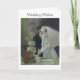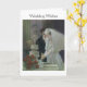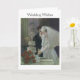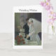 En vintage som illustrerar en brud och groom som skär den första delen av deras bröllop-kaka. På kortets framsida står "Bröllop Önskemål" och budskapet på kortet är: "Önskar dig många fler dagar som lycklig, många fler tillfälle för firande och en hel livstid för kärlek och skratt".