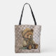 Vintage brun nalle med brun hatt, kostym och blått jackar med texturerad metallbakgrund.