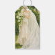 Denna bild visar en elegant brud som står graciöst i en frodig, solbelyst trädgård. Hon bär en elfenbensfärgad brudklänning prydd med delikat spets, subtil pärlstickning och en mjukt samlad midja som accentueras av en juvelbesatt bröstnål. En lång, genomskinlig slöja flödar bakom henne och fångar ljuset och ger en känsla av rörelse och eterisk skönhet. Bruden blickar varsamt nedåt mot en yppig bukett av vita liljor och grönska, hennes uttryck lugnt och eftertänksamt. Omgiven av tät lövverk och höga träd renderade i mjuka, måleriska toner frammanar scenen en romantisk, tidlös atmosfär inspirerad av klassisk illustration och jugendest