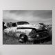 Svart och vitt foto på en Buick-bil i ett skräpkyard