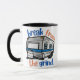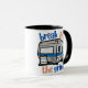En kaffekopp med en vintage husbil, med frasen "Break from the Grind" centrerad runt bilden. Designen antyder en nostalgisk och äventyrlig flykt från den dagliga rutinen.