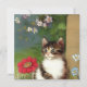 Kort med en söt kattunge illustration. En vit katt med mörk bruna rand-relaxer i en vår blommor trädgård. En perfekt gåva till kattälskare!