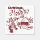 A vintage illustration of a cozy winter season with a wooden cottage in the woods and a Santa Claus.