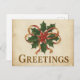 Festive restored antique Christmas card illustration featuring colorful spray of green and red holly gathered in a red bow with a shiny brass bell, cute bird and Merry Christmas message in fancy gold script.