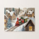 Cozy vintage-style red and green Christmas train chugging through a snowy winter village, with warm glowing cottage windows and tall pine trees, turned into a charming jigsaw puzzle. A relaxing holiday activity and nostalgic gift for train lovers, families, and anyone who enjoys classic Christmas village scenes.