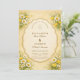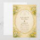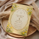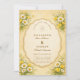 En delikat vintage bröllopsdesign inspirerad av romantiska landsbygdsträdgårdar. Mjuka akvarellprästkragar och gula vilda blommor blommar i hörnen runt en elegant scalloperad ram, mot en varm pergamentbakgrund med antika botaniska charm. De ömma blomdetails och klassiska typografin skapar en tidlös trädgårdssthetik, perfekt för par som planerar en romantisk utomhusfirande omgiven av naturen.