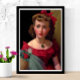 Vintage porträtt av ett vackert dam i röd klänning, band och bukett av ro.