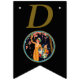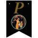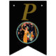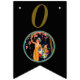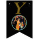 Den här flagga-formade buntbanderollen Grattis på födelsedagen är svart med gyllene brev och en vintage dam i en gult med en blomstrande låda där man plockar blommor från rosa av körsbär från söt från en blommar inuti en träd och blå cirkel. Anpassa födelseår med mallarna.