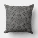 Ett kvadratiskt dekorativ kudde med ett fuktmönster av vintagens daisy och löv med scrollsar i svart på mörk grått.